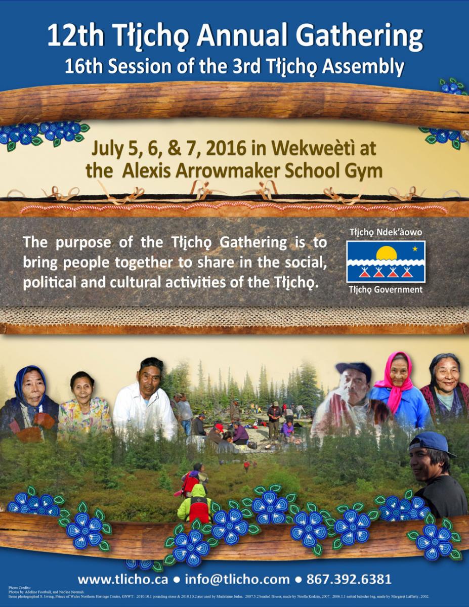 12th Annual Tłı̨chǫ Gathering and 16th Session of the 3rd Tłı̨chǫ Assembly, on July 5, 6 & 7, 2016 in Wekweètì at the Alexis Arrowmaker School Gym.