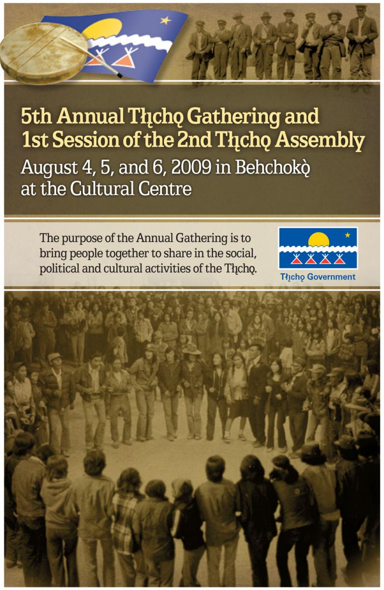The 5th Annual Tłı̨chǫ Gathering and 1st Session of the 2nd Tłı̨chǫ Assembly took place August 4, 5, and 6, 2009 in Behchokǫ̀ at the Cultural Centre.