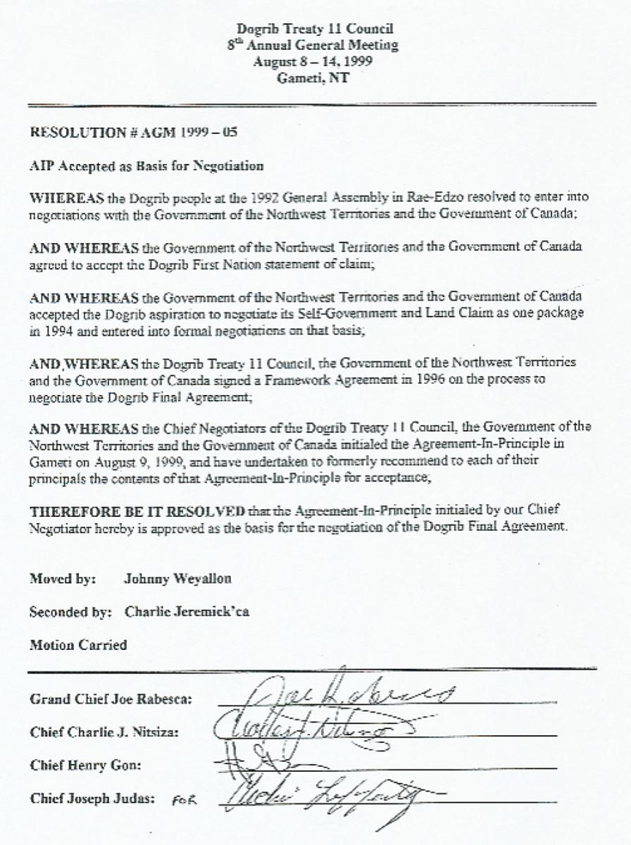 The Agreement-in-Principle is a milestone, it represents the fulfillment of a Resolution made the Dogrib General Assembly back in 12992. It was with the support and patience of the Elders and the rest of the community that Dogrib negotiators were able to complete this work. Now it is up the Dogrib people to send us forward toward a final Agreement, " said John B. Zoe, Chief Negotiator for the Dogrib Treaty 11 Council.