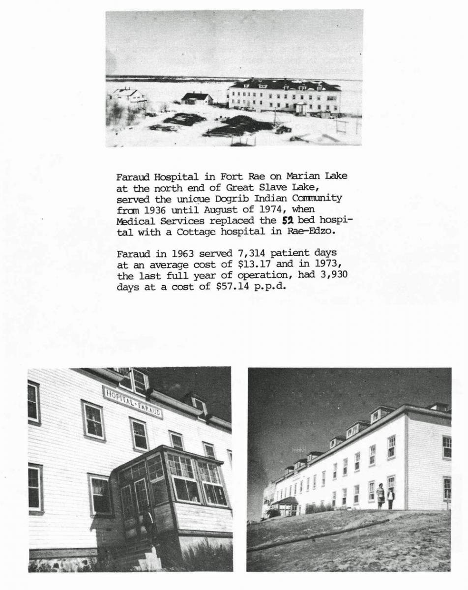 Faraud Hospital in Fort Rae (Behchokǫ̀) was opened from 1936 until August 1974. Named after Father Henri Faraud a priest and later Bishop from 1862-1889.