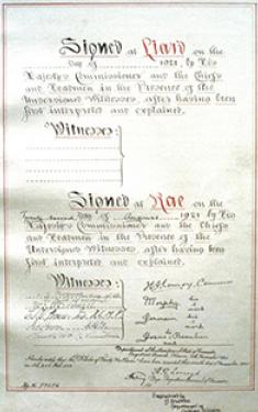 Treaty 11 was negotiated during the summer of 1921. During the negotiations, many concerns were raised, but Canada assured the people that they would not lose their right to hunt, fish and trap. By the end of the summer, Chief Monfwi signed the Treaty at a ceremony in Behchoko.