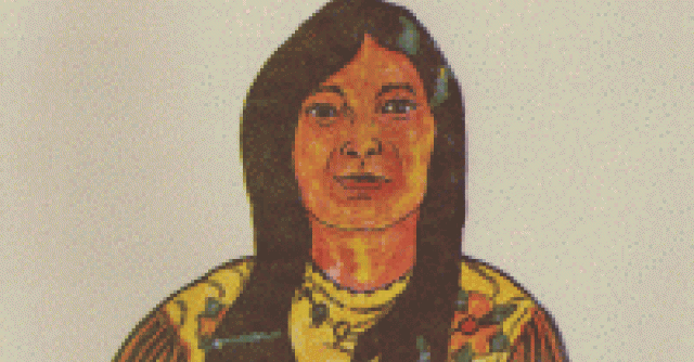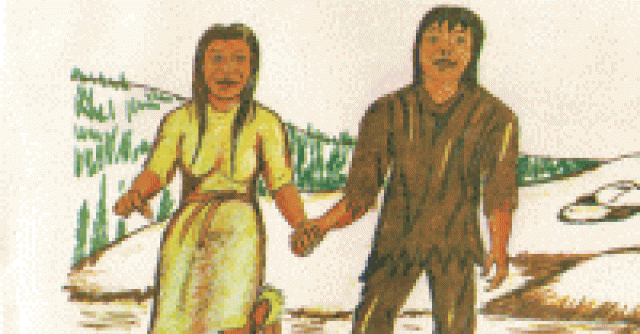 When she was close to the old camp, she noticed a man standing on the trail ahead. At first she couldn't see him properly, but as she came closer, she saw that he was a very handsome person. As she approached, he said, "Where are you going". "I am going back to our camp to fetch my scraping board which I left behind." The man thought for awhile and then suggested that she go with him to his camp. At first the young girl was uncertain. But since the young man was so handsome, she finally agreed to go. When they arrived at the camp, they made themselves at home.