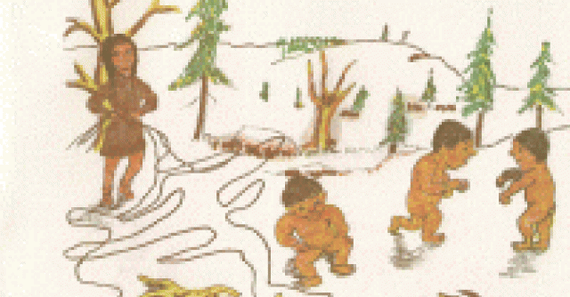 One day when she returned to camp, she found footprints of children in the ashes by the fireside. That night she thought very hard about the footprints and her puppies. Quietly she tied a string to each of her puppies and let the strings outside to the trail in the woods. The next day the mother set off to check her snares. When she had gone, one of the puppies said, "Now that our mother is out of sight, let's continue our games." Then the three puppies took off their hides and immediately changed into three small children. Meanwhile the mother was watching from the forest. As the children played, she pulled the strings toward her. She managed to get two of the hides, which she threw into the fire. Only the little girl was quick enough to jump back into the skin. So, she remained a dog, while the other two remained little boys.